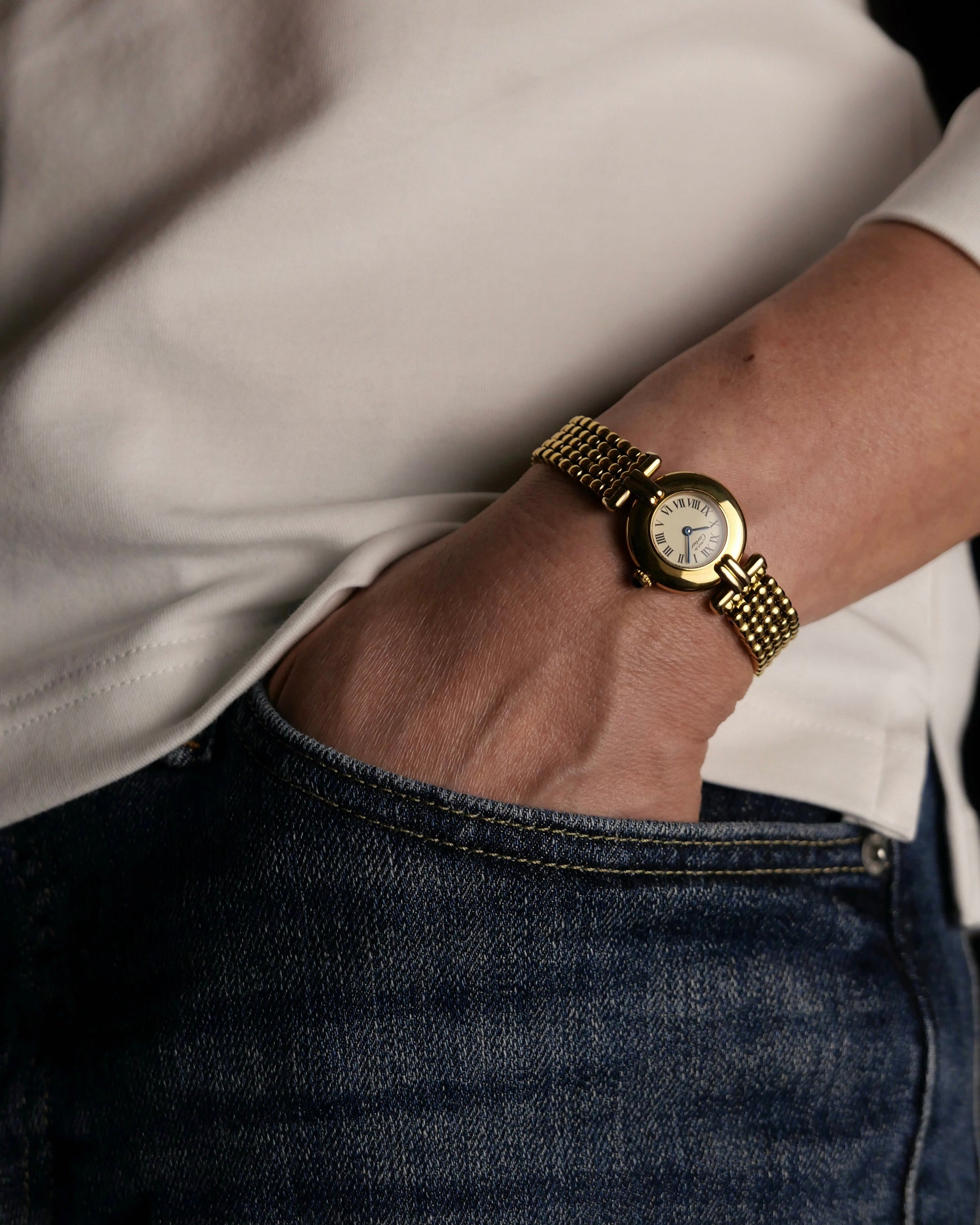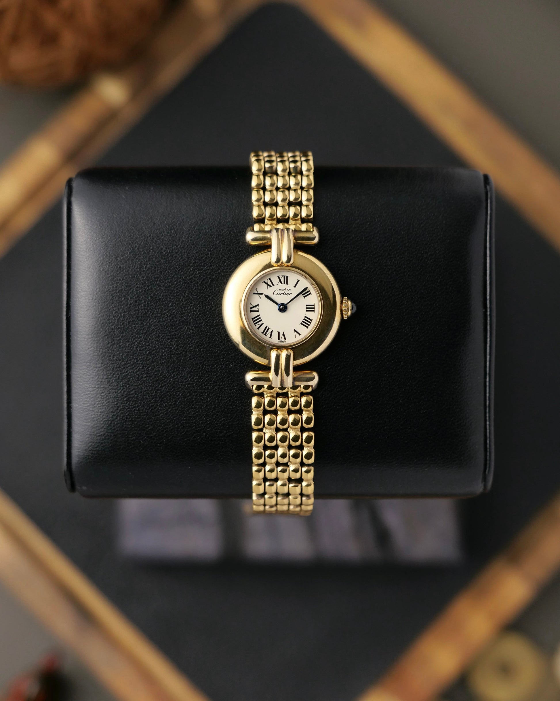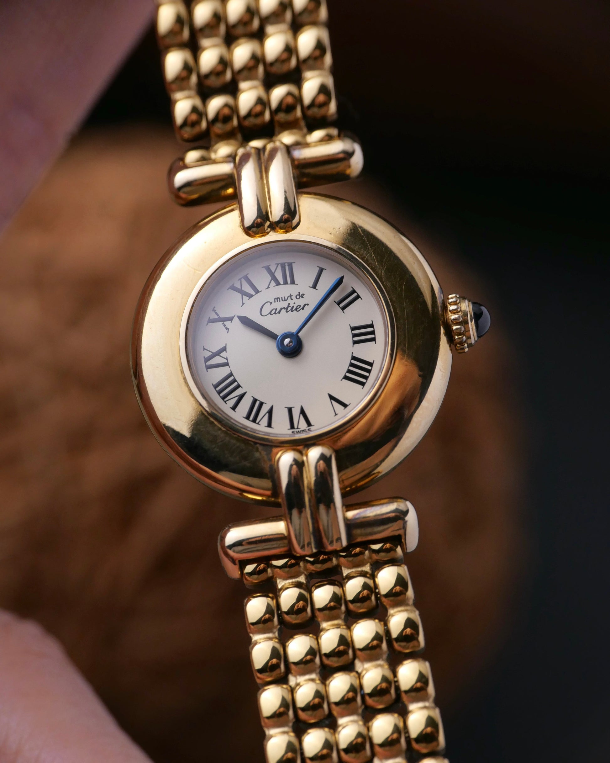 The Cartier Colisée is a lesser-hyped watch from the Must de Cartier line—Cartier’s initiative to democratise luxury with more affordable watches in 20-micron gold-plated 925 sterling silver (“Vermeil”), cutting back on the use of gold, but still very much full precious metal. The design is distinct from, and as distinctive as Tanks, with circular cases (inspired by Roman colosseums), T-bar lugs and the unmistakable cabochon-ed crowns. Very timeless, especially in this particular variant with a light cream egg-shelled dial, blued sword hands and oh-so-Cartier Roman numerals. Paired with a beaded bracelet, the vibe is jewelry-adjacent, but we are including an original Cartier leather strap and buckle for times when you might want a more subdued presentation. Fantastic value that belies a less common, but very classical Cartier!