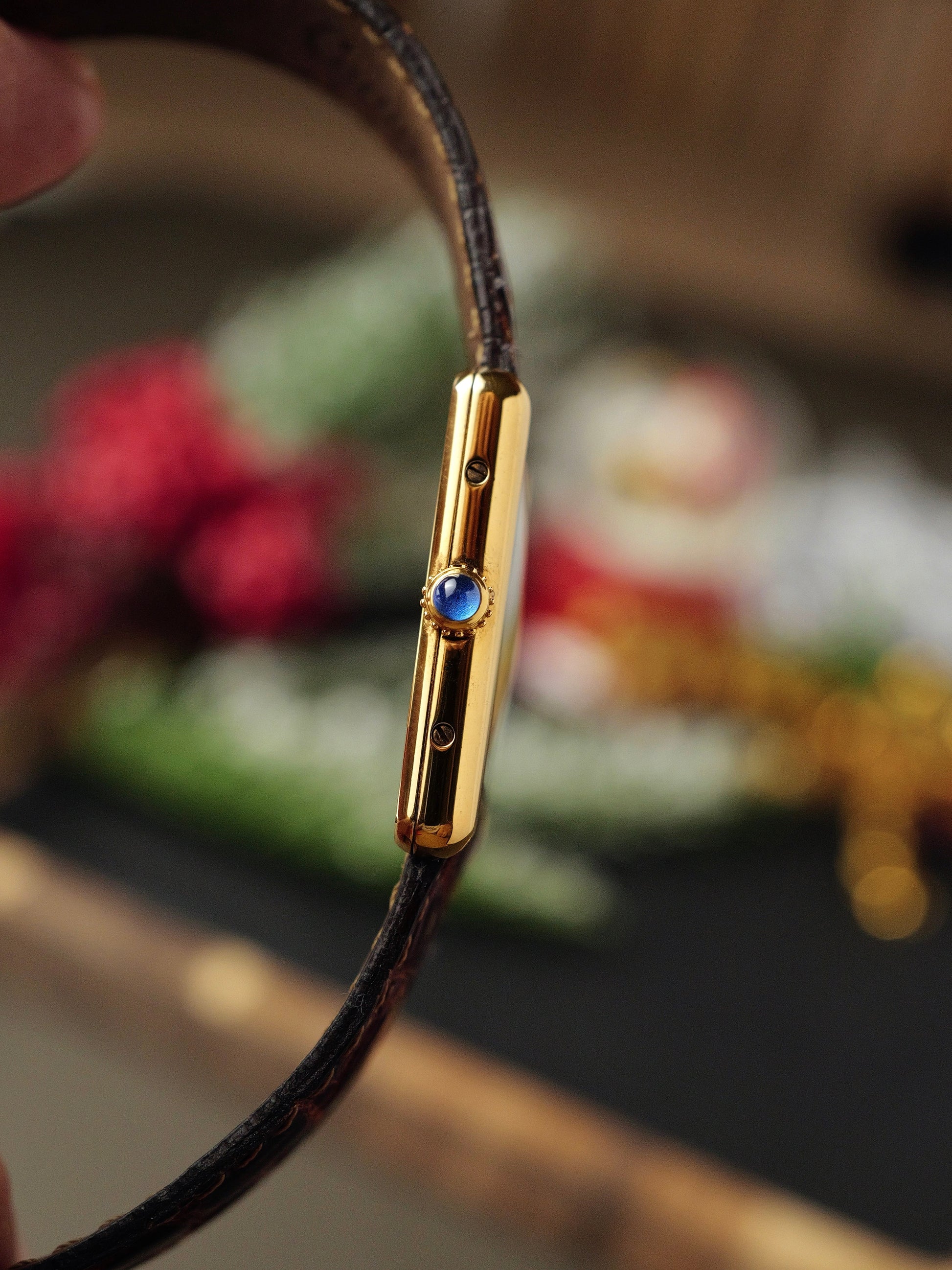 The importance of Must de Cartier Tanks is often overlooked… instrumental in saving Cartier 50 years ago when the boom of post-WWII France faded, and with it, demand for luxury. At the same time, cheap mass-produced quartz watches were flooding in from Asia. Cartier’s solution? Make accessible versions of the (otherwise full-gold) iconic Tank Louis but in gold-plated 925 silver, with Swiss quartz calibres. This runaway success kept Cartier’s watch business afloat, unlike much of the European industry. This version is in the LM size, with a “Column Dial”, lauded as one of the most unique Tank dial variations. Vintage aficionados love the on-brand Roman numerals, arranged not around the dial but in two minimalist, symmetrical columns, each flanked by 4 raised golden rails. A very modernist graphical riff on Cartier classicism. Can you think of any other watch that does markers with this verticality and rhythm? We can’t.