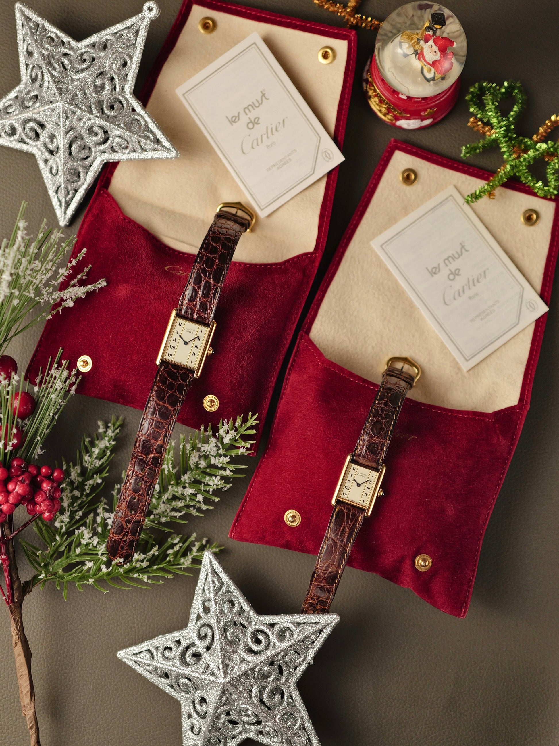 9/10, with light hairlines and some slight wearing of the plating on the ends of the brancards. Hands, original unreplaced crystal, and original “Swiss-only” dial are clean. Caseback engravings/hallmarks deep and crisp, with service sticker remaining. Original strap used but still plenty usable. Original Cartier buckle has light hairlines. Movement in excellent health and quartz-accurate.