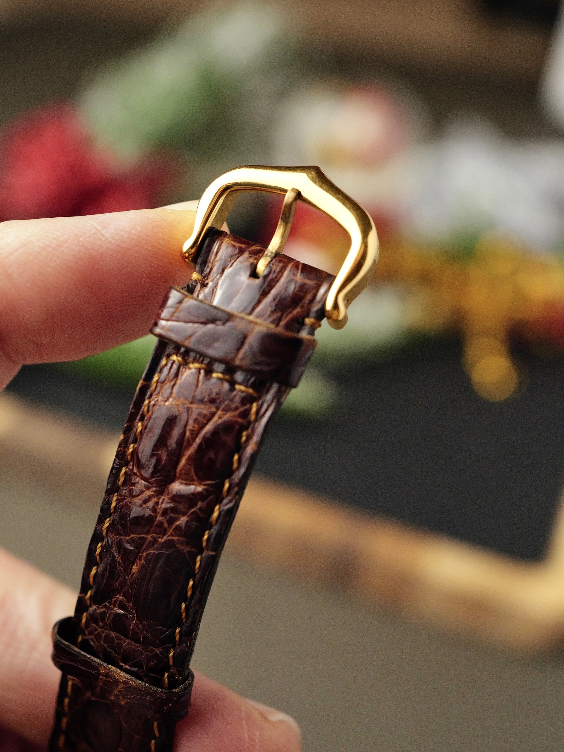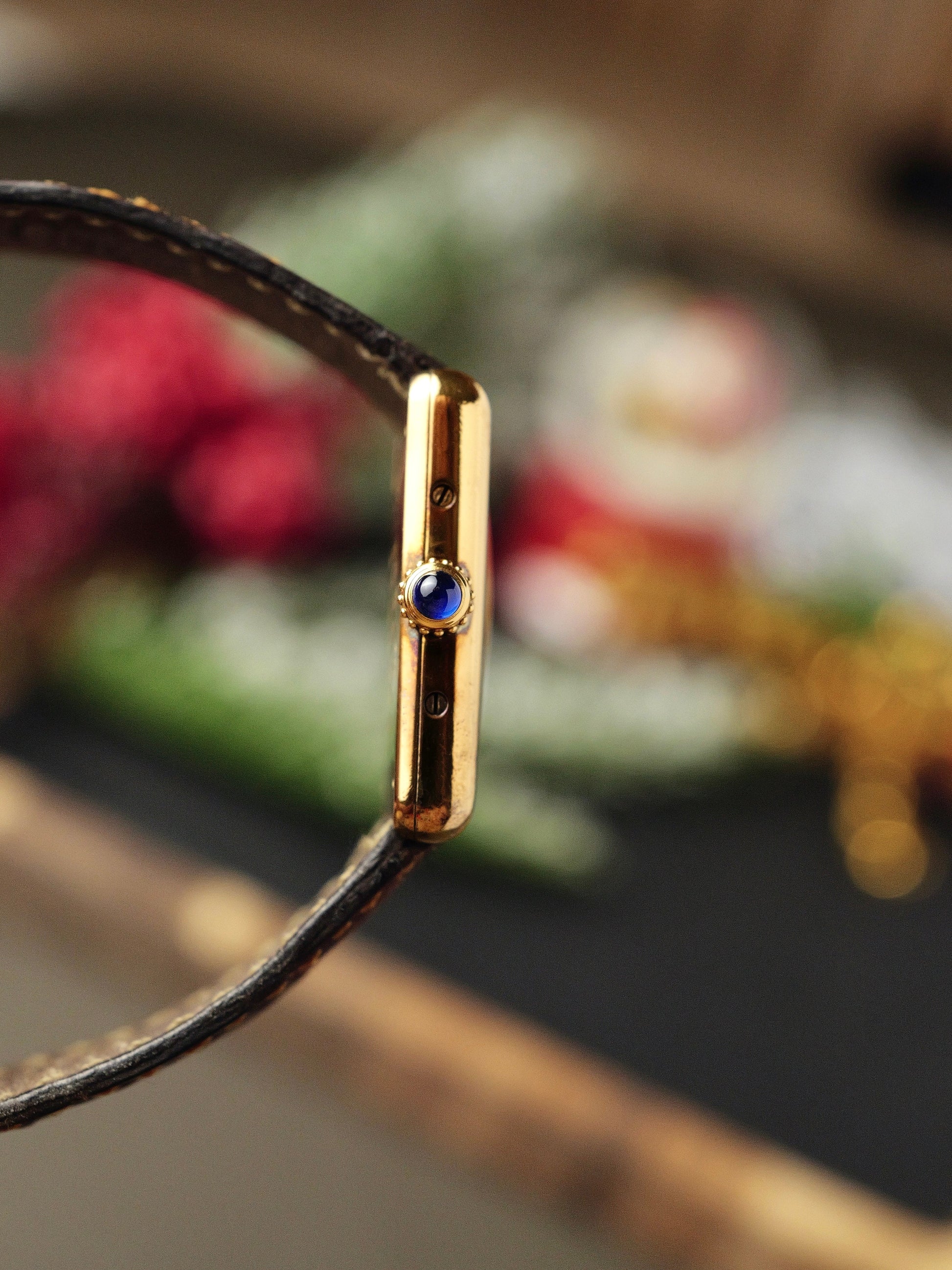 8.5/10, with light hairlines and scuffing mostly along the brancards. Hands, original unreplaced crystal, and original “Swiss-only” dial are clean. Lovely rainbow patina on parts of the case, coveted by vintage connoisseurs. Can be removed in minutes upon request but it’d be a shame as it developed naturally over decades! Caseback engravings/hallmarks deep and crisp. Original strap used but still plenty usable. Original Cartier buckle has light hairlines. Movement in excellent health and quartz-accurate.
